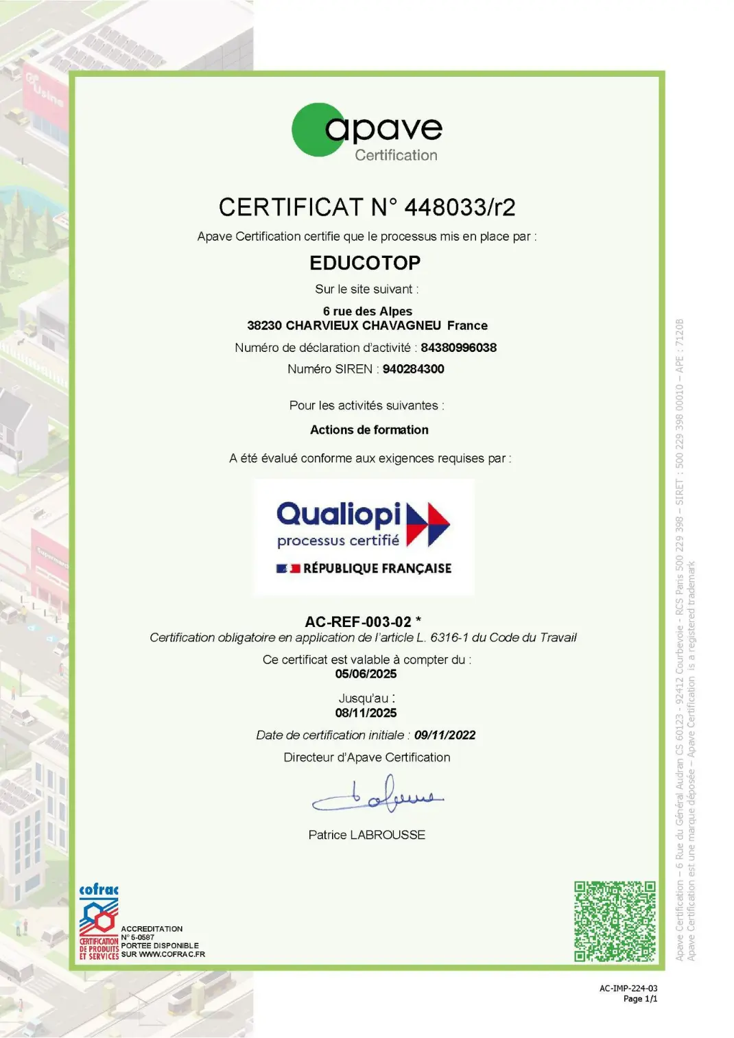 Organisme de formation certifié Qualiopi crée en 2015 et référencé auprès de la DREETS d'Auvergne Rhône Alpes sous le n° NDA : 84 38 09 96 038